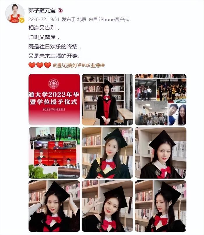 北京时间6月22日,中国女篮国手郭子瑄在社交平台上和大众分享了自己毕业的好消息。郭子瑄晒出了一系列照片,开心地表示自己已经毕业啦!在文案中她这样写道:“相逢又告别,归帆又离岸,既是往日欢乐的终结,又是未来幸福的开端。”从她的话中可以看出,她对自己的未来无比期待。