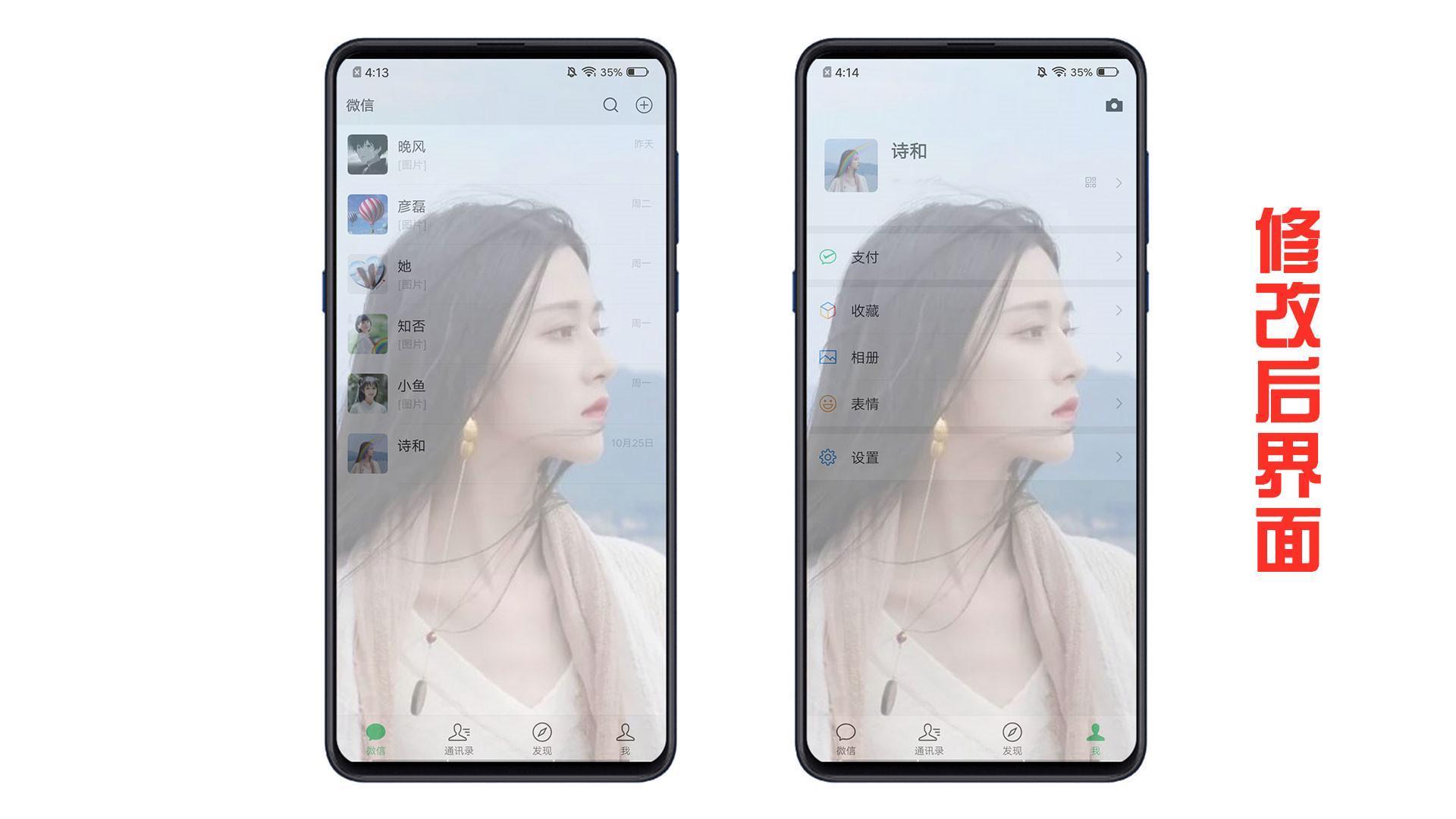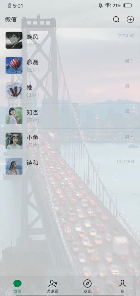 再来看下设置了微信半透明壁纸的效果吧。