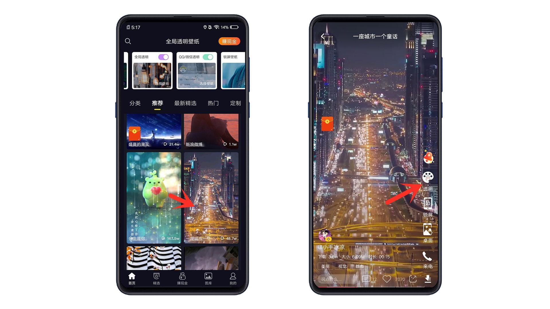 在首页中选择一个动态的视频壁纸,然后点击上方的透明选项,再进入设置透明度即可,同样也可以设置本地视频,非常的方便。