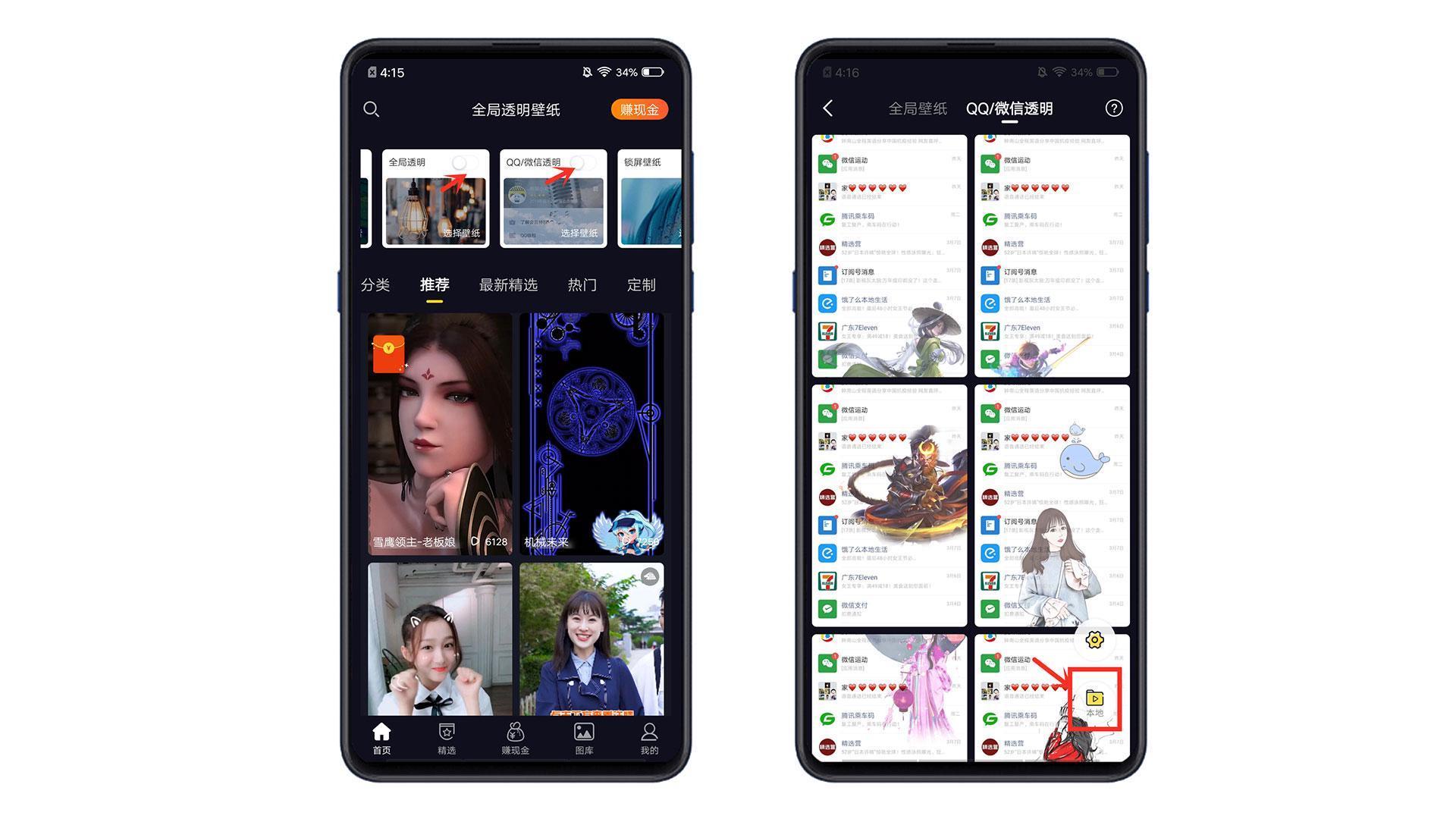 获取后打开,在首界面的上方打开全局透明和QQ微信透明按钮,进入后,有软件给我们提供的透明壁纸,也可以选择右下角的本地按钮,选择本地照片。