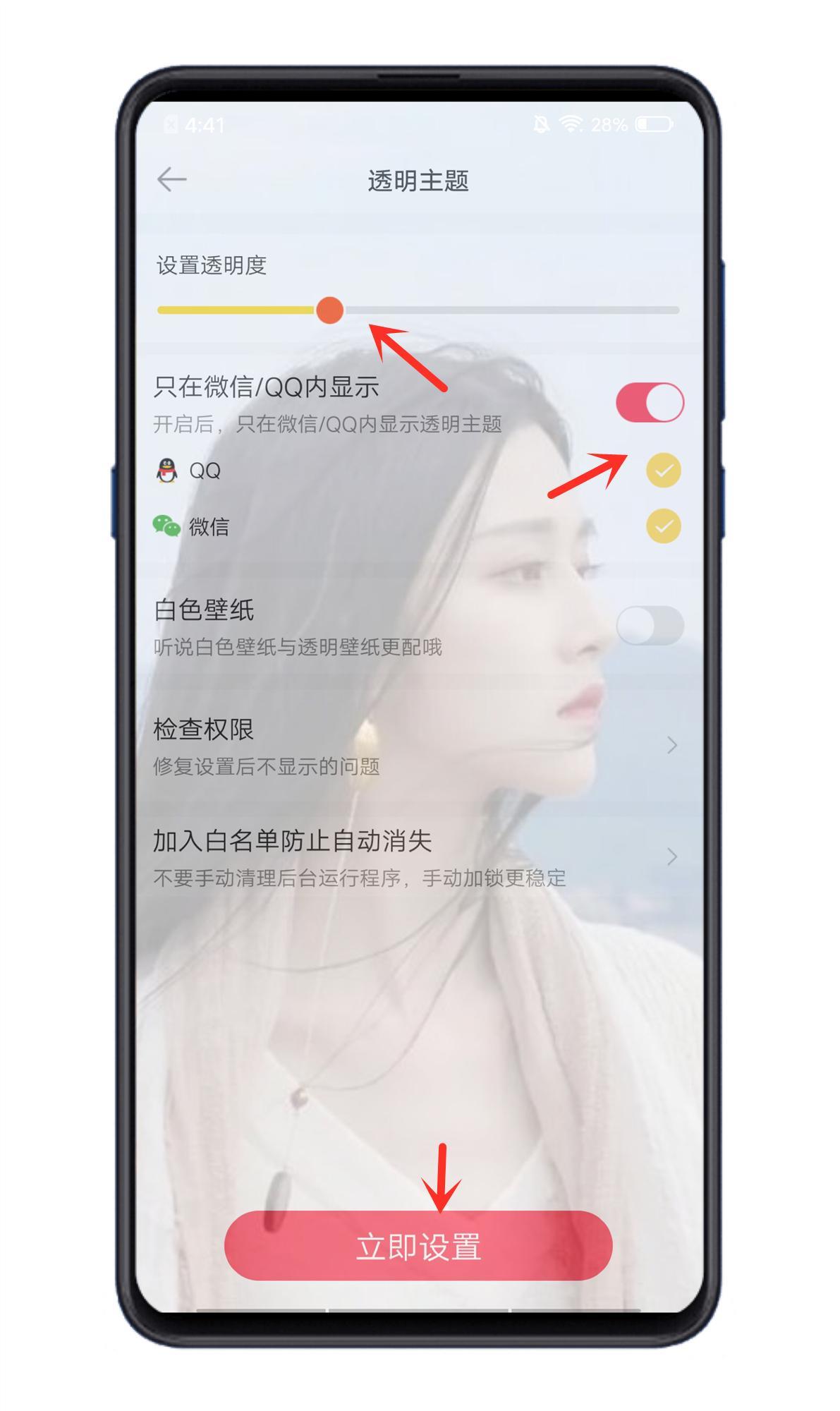 进入后,上面设置透明度,如果不想全局都透明可以开启只在微信和QQ内显示,然后点击立即设置即可。