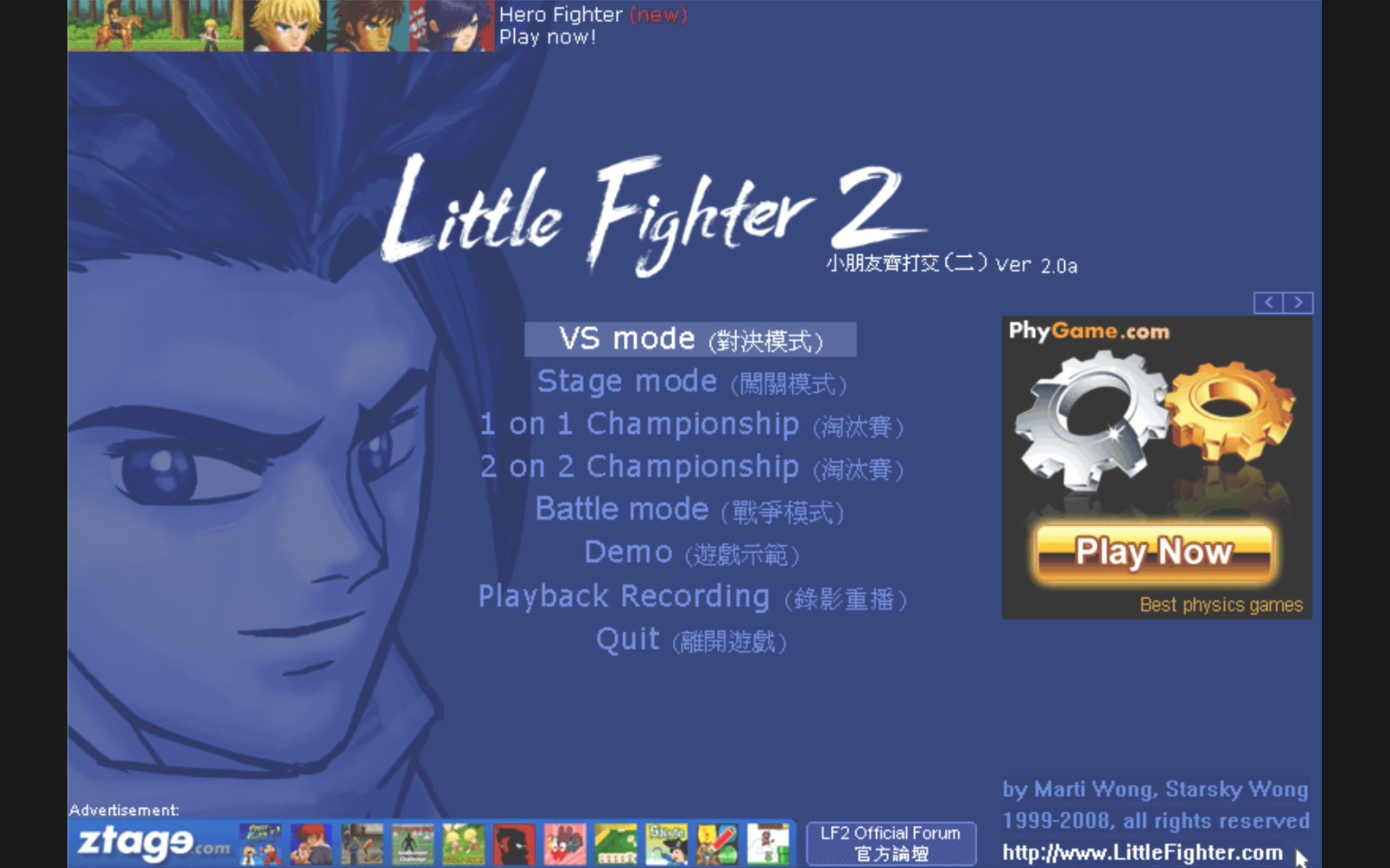 《LF2》由小熊(Marti Wong)和浩然(Starsky Wong)公共开发,1999年开始开发,于2002年正式发行。多种模式,支持最多8人同台竞技,众多的角色选择,玩法简单爽快。极强的耐玩性, 加上易于控制, 下载方便, 它一直广受全球青少年的爱戴!改版《LF2》也像雨后春笋一样。游戏也成为了当时Tucows 中唯一拥有五星的格斗游戏!