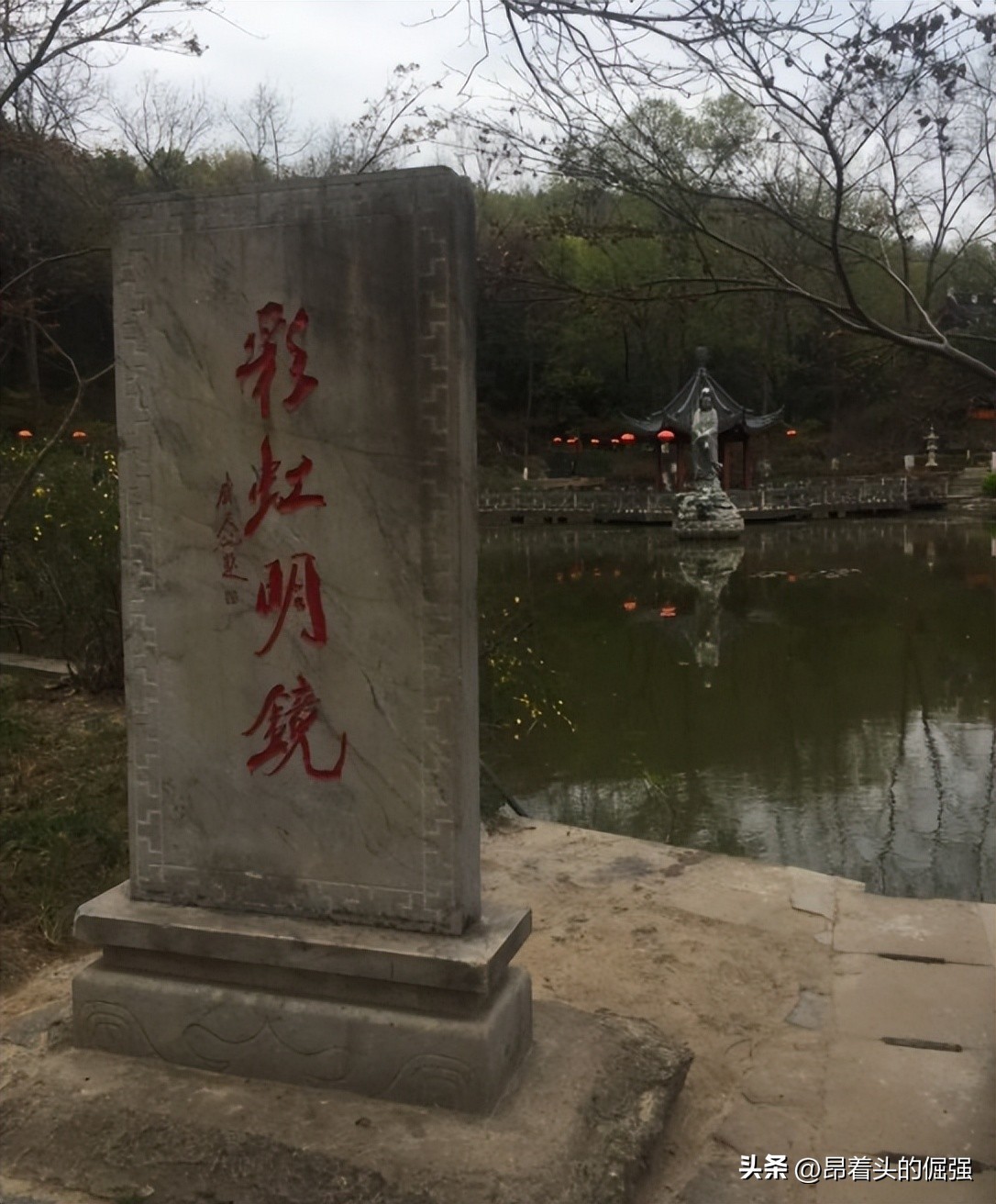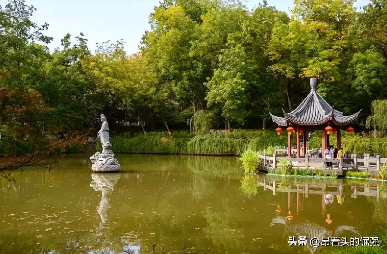 进了山门,一个四四方方的明镜湖,映入眼帘,这里是进入寺庙的必经之处,湖上有观音石像和六角亭,在湖边还有青铜经文巨型雕塑,在阳光照射之下闪闪发光,显得非常神圣,有种进入净土的平静感,心灵也得到荡涤。