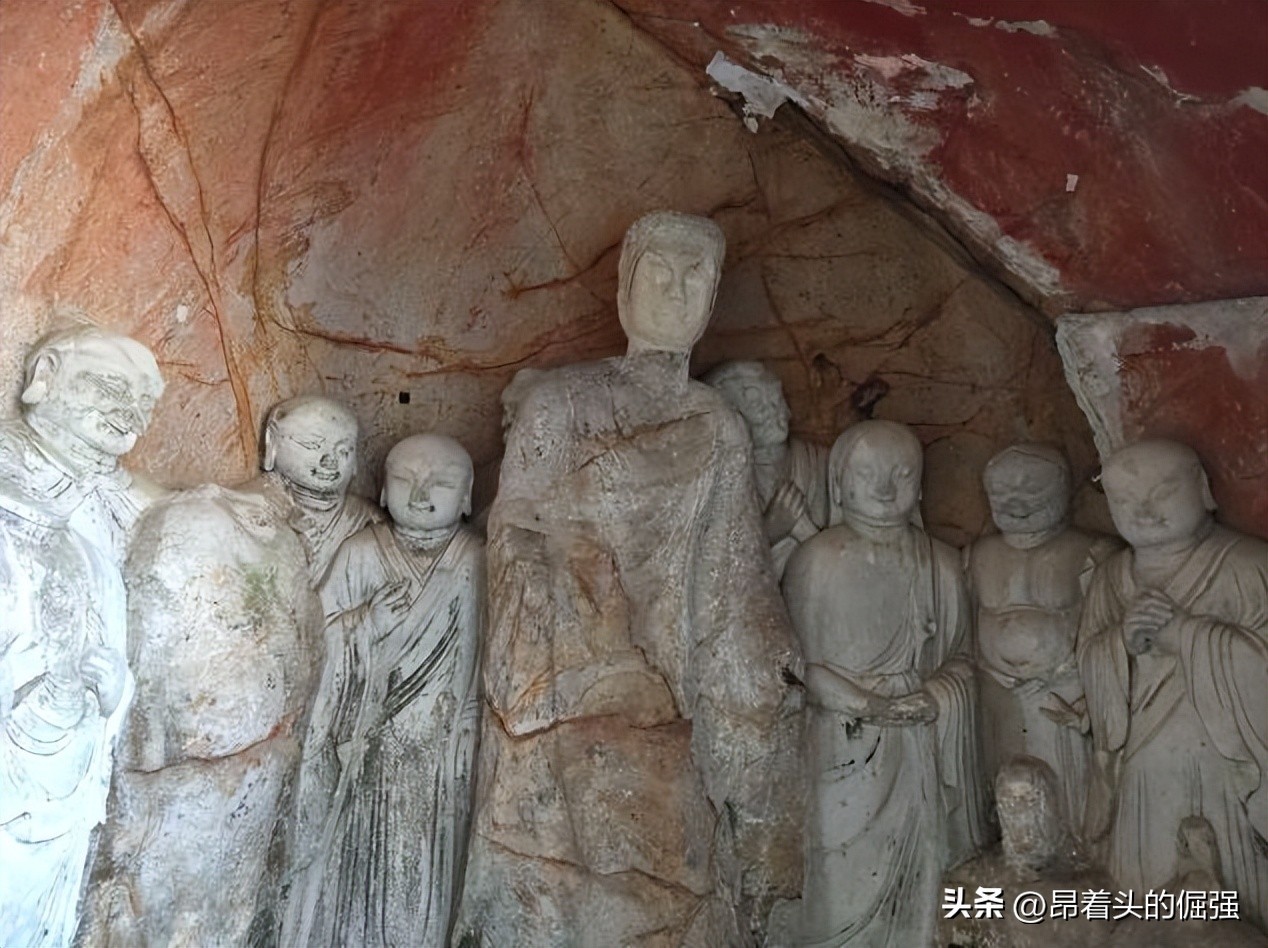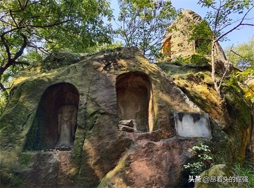 千佛岩,它位于舍利塔东边的山岩中,这里是南朝齐梁两朝所开凿的佛像,后唐宋元明各代相继都有开凿,据传佛像佛龛共有700尊左右,现存515尊,号称千佛岩。其中有一大佛阁,又称三圣殿,其佛像尤其巨大,中间无量寿佛高十多米,边上是观音、势至菩萨左右立侍,中间大佛的额头有颗珠子,据说在适当的季节,适当时刻会放出光芒,称为佛光普照。举世闻名的“东飞天”就在102号佛龛中,这个洞龛非常小,共有5座佛像,洞顶的两组飞天为橙色,线条清晰可辨,中间佛像头顶的火焰隐约可见,与敦煌飞天遥相呼应。