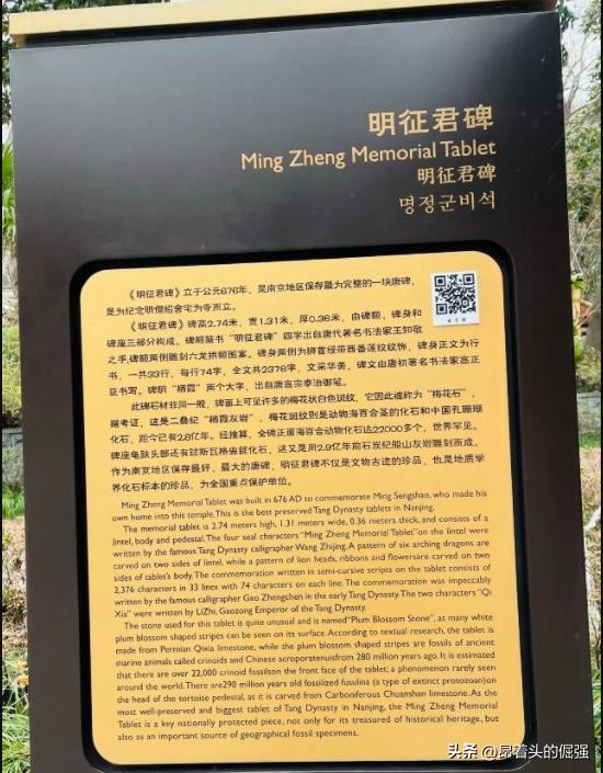 这块碑材更有来历,采自栖霞山,是栖霞组灰岩石,表面梅花状斑纹均是2.8亿年前生长于浅海中的动物海百合茎化石与中国孔珊瑚化石,有22000多个,是地质界罕见的化石标本,有“梅花石”之称。明征君碑也是全国文物保护单位。