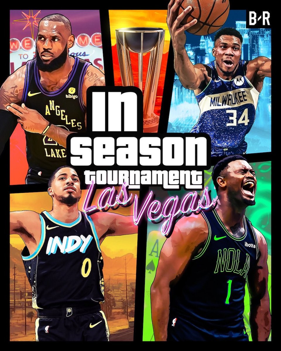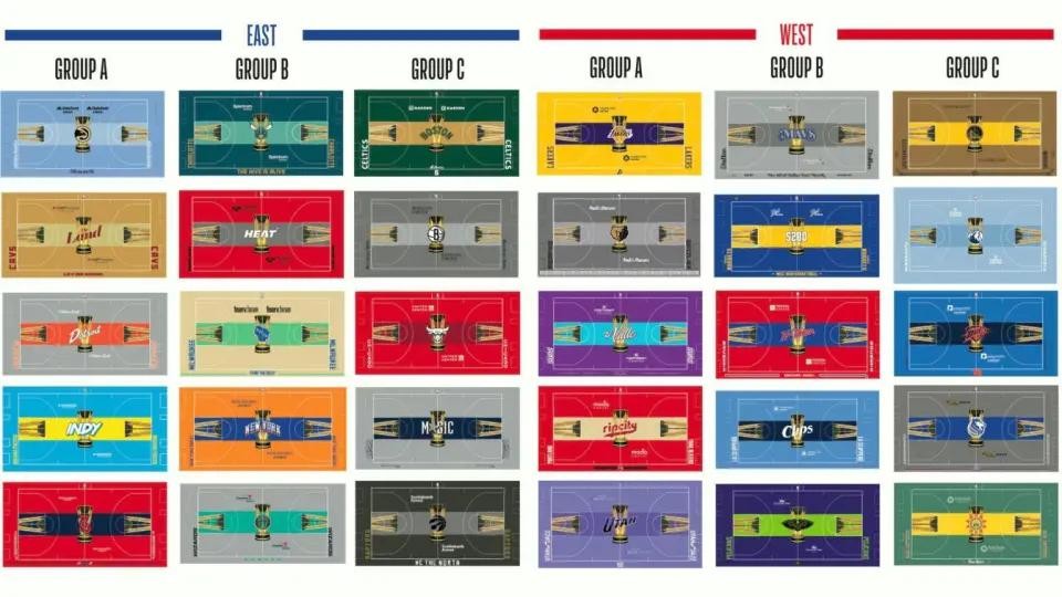 NBA季中锦标赛是NBA官方于本赛季设立的一个全新的赛制,NBA的全部30支队伍都参与其中。季中赛穿插在NBA的常规赛之中,并且NBA也为其设计了一套独特的视觉传达系统——也就是那看着“辣眼睛”的地板。