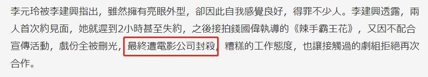 某电影导演李建兴表示自己来蹭热度,说曾与李元玲合作,第一次见面她就失约,而迟到几小时也是常态,她的这种态度得罪不少人,还因不配合宣传而被删光所有戏份,遭到电影公司封杀。