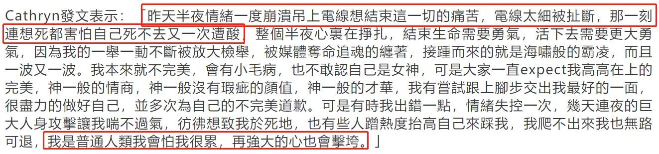晒图的同时她发了很长一段文字,说自己在前一天的半夜,情绪一度崩溃,吊上电线想结束痛苦,但电线太细被扯断了。她突然害怕“想死又没死”会不会再一次被网暴,一颗心整夜挣扎。