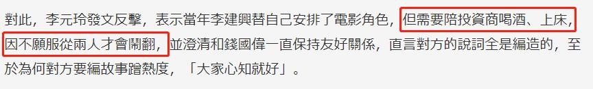 被李建兴爆料后,李元玲澄清说自己是因为拒绝陪酒陪睡才与李建兴闹翻,称对方都是编故事。