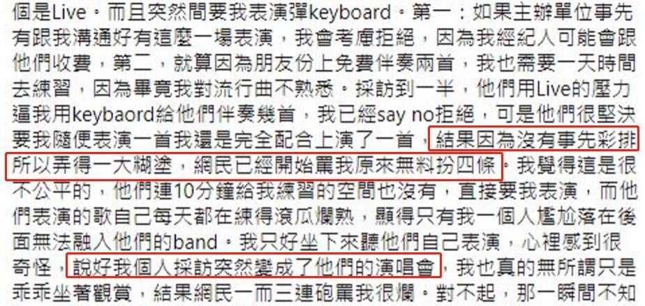 她说自己为失控和丑态百出道歉,她是有错,情商不够,应该忍气吞声一笑带过。然后她解释了自己不习惯用电子琴与乐队即兴表演,不要觉得厉害的音乐家就是什么概念的音乐都会,她相信所有表演背后都有充足的练习与准备。