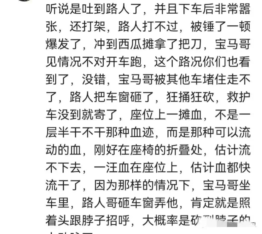 2、可以肯定的是,宝马车主肯定有错在先,凶手砍杀他时,根据视频音像,他有大声求饶,然后上车试图开车逃离。但只走出了数百米的距离,由于密集市区,车子根本开不快,便被凶手持刀追上。