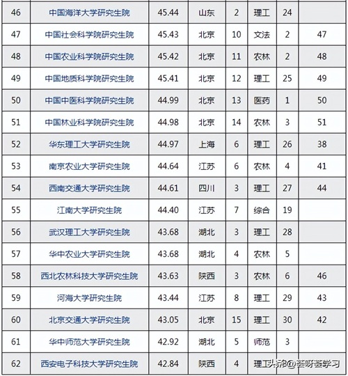 本次上榜的研究生院仅62所,名单如下所示: