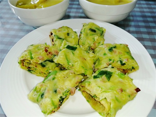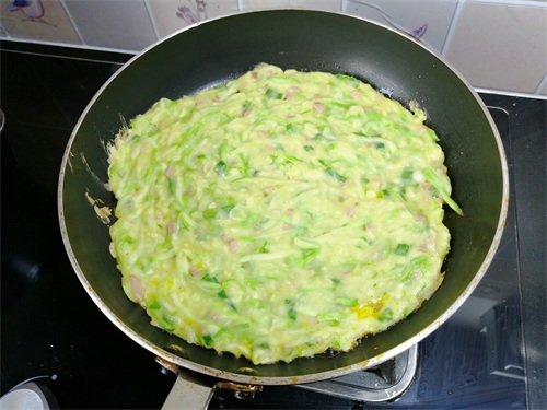 所需材料:西葫芦1个,鸡蛋2个,火腿一小块,葱,面粉,做法如下: