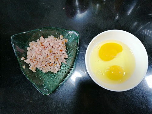 2.火腿切小粒,打2个鸡蛋,和葫芦放一起搅匀