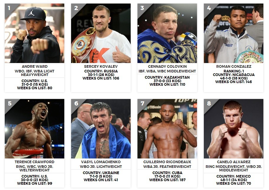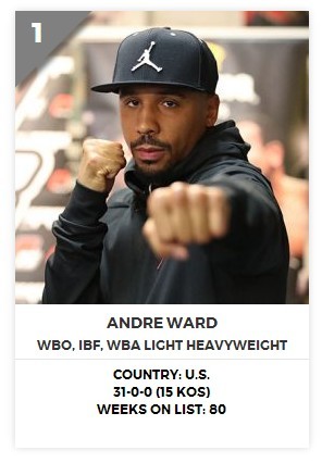 在最新一期象征着综合实力P4P前十排名榜单上,33岁的沃德从上周的第二跃居至第一的位置,这是沃德出道拳坛12年来首次加冕该宝座。沃德曾获得2004年雅典奥运会拳击金牌,1996年至今在业余和职业拳坛连胜150场,保持了21年的不败金身。而从2004年转入职业拳坛以来,沃德拿下了超中量级和轻重量级两级别世界冠军,击败了凯斯勒、道森、弗洛奇、亚布拉汉、米兰达、科瓦列夫、比卡、格林、巴雷拉、罗德里格兹等一批顶尖悍将,成为继罗伊·琼斯和梅威瑟之后,最近20年来第三位世界公认的超一流美国拳王。在去年11月与科瓦列夫的一战中,沃德上演了惊天大逆转,将轻重量级三条王位集于一身,据悉沃德计划在6月17日与俄罗斯人科瓦列夫进行二番战。