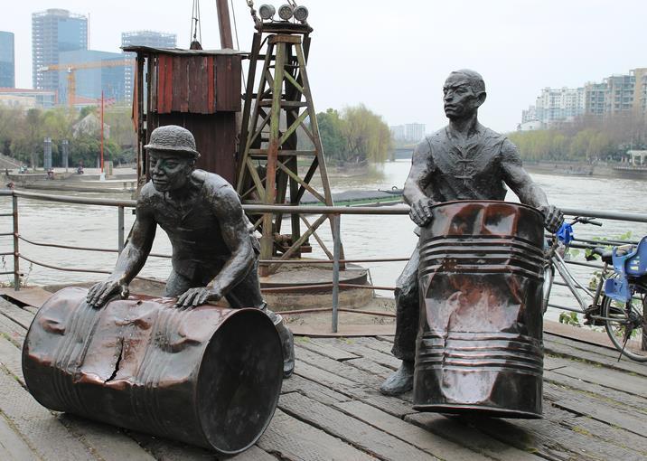 沿着街区,可以来到运河边。河边有一雕像,是码头的工人在忙碌。千百年前,这里商贾云集,舟来人往。如今,繁华褪去,剩下的是都市快节奏中,难寻的慢生活。
