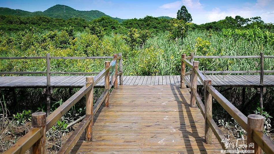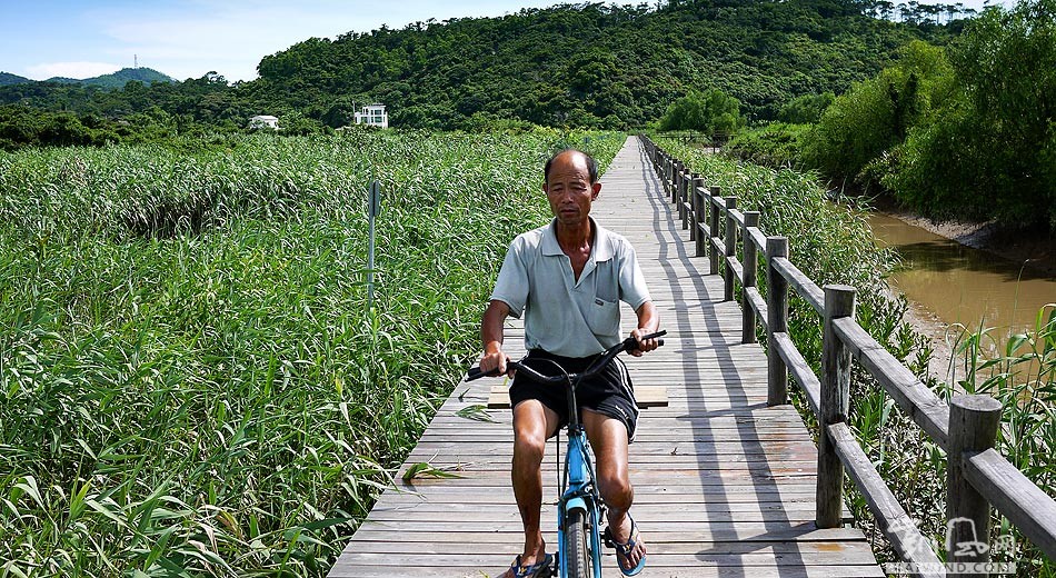 夏日炎炎,一位村民骑着自行车经过淇澳红树林自然保护区。