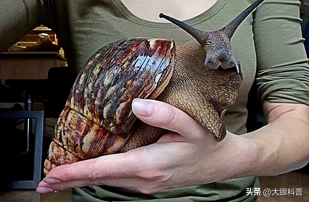 但这只蜗牛真的很大!它的身长超过20厘米,竟有人手那么大。由于体型大、繁殖快、食量大,对农业造成的破坏最大。