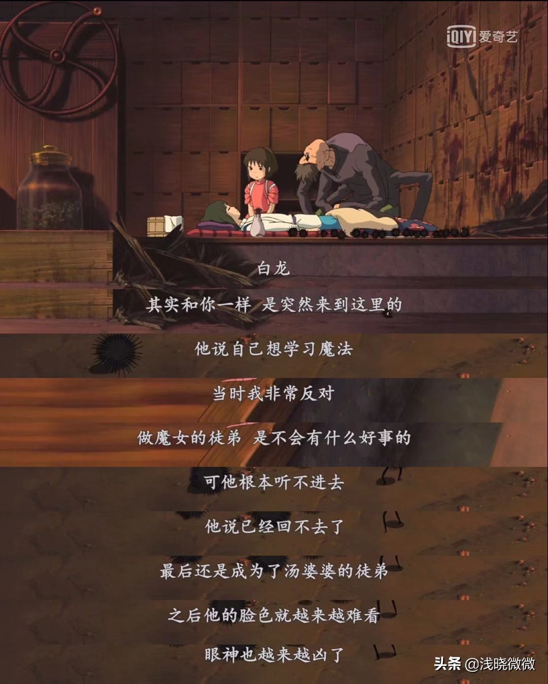 白龙受伤后,锅炉爷爷跟千寻说了一段话,“白龙是突然来这里的,他说自己想学魔法,当时我非常反对。做魔女的徒弟,是不会有什么好事的,可他根本听不进去。他说已经回不去了,最后还是成为了汤婆婆的徒弟,之后他的脸色越来越难看,眼神也越来越凶了。”