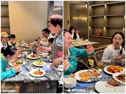 吃自助餐的时候,自己只顾低头吃东西,也不主动去拿食物给主人家吃;而阿姨一直在拿东西给大家。小凤儿子给她主动递食物,她也不懂给面子,拒绝了孩子的一片心意,小凤也是一脸惊讶。