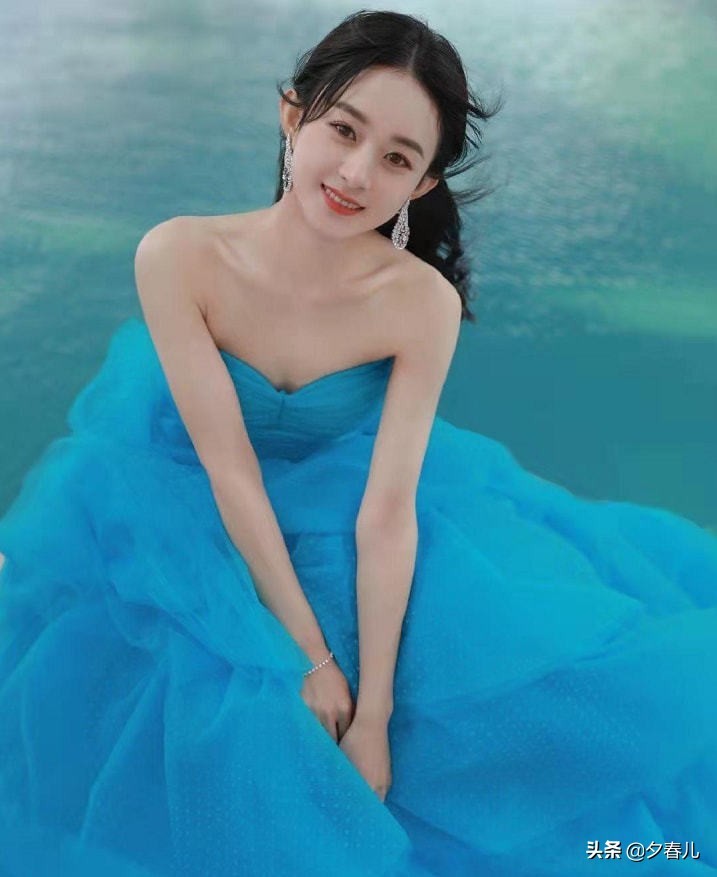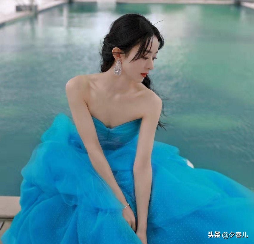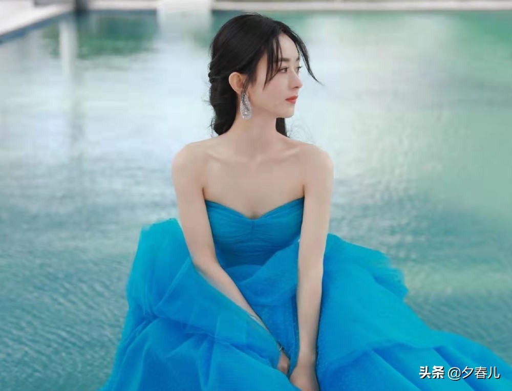 赵丽颖在泳池边凹造型,穿蓝色纱裙坐在地上摆拍,高级又减龄