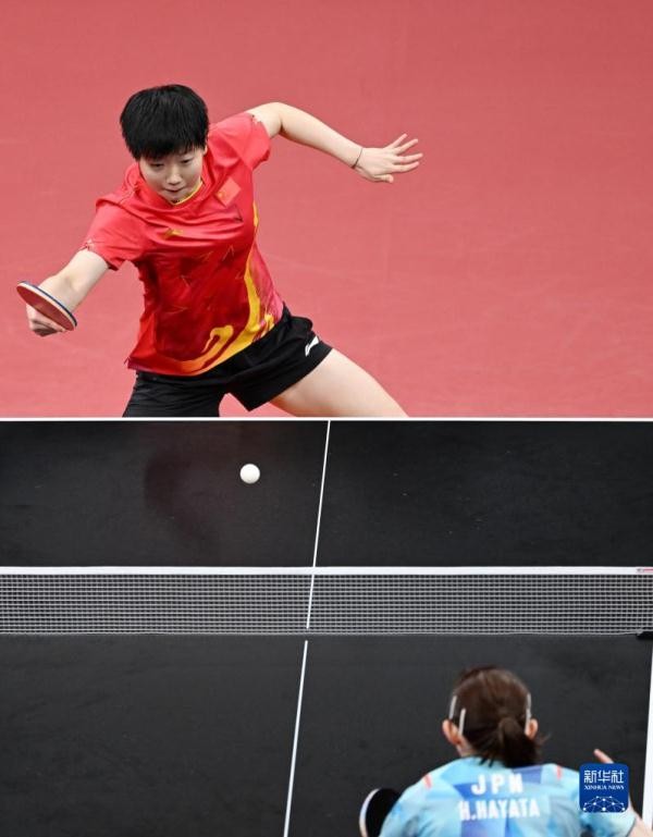 9月26日,中国队选手孙颖莎(上)在比赛中回球。她以3比1战胜日本队选手早田希娜。