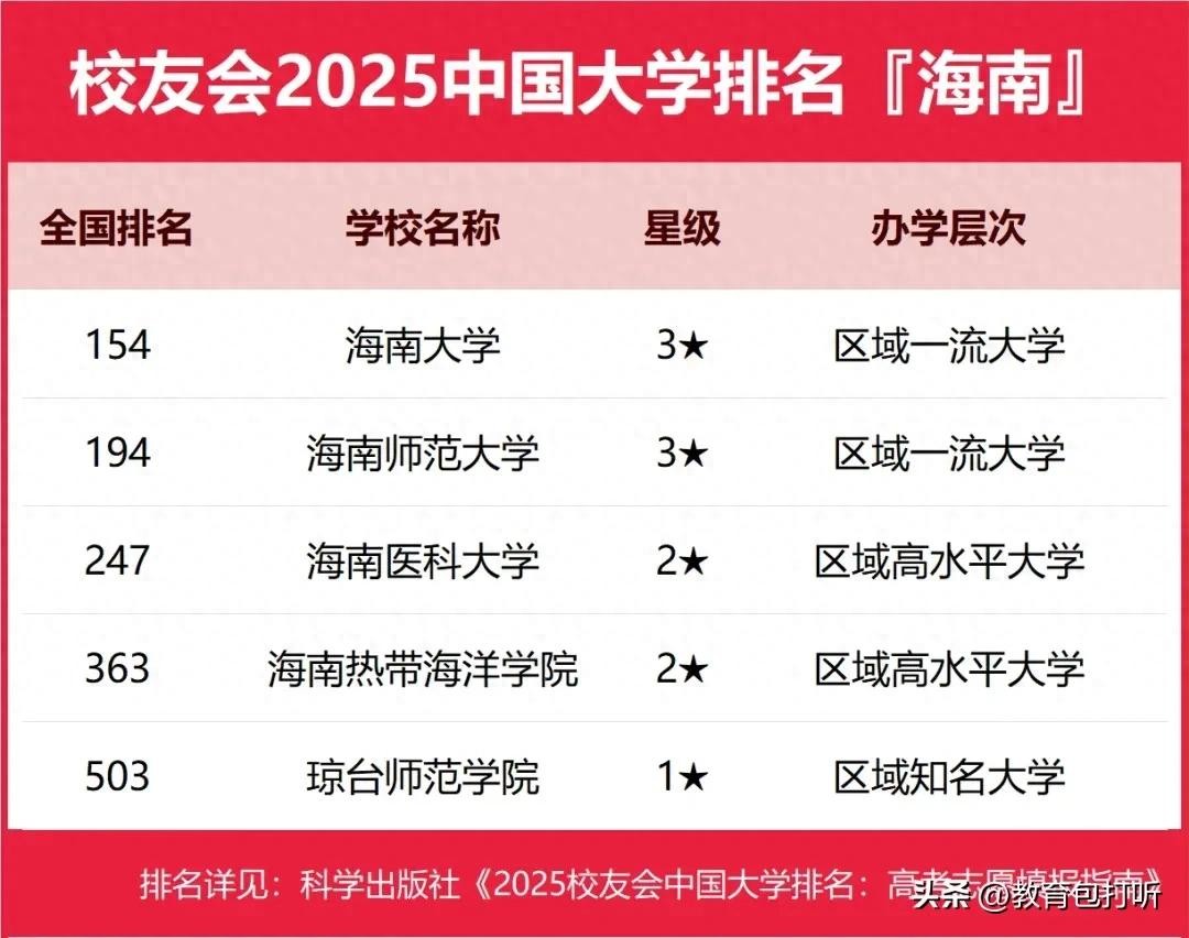 校友会发布2025年全国大学排名,海南大学排名全国第154位,我想过这所政策性“双一流”大学排名可能有点低,但真的没想到会这么低!目前海南总共有九所大学,其中公办本科有五所,除了海南大学外,还有海南师范大学、海南医科大学、海南热带海洋学院和琼台师范学院。