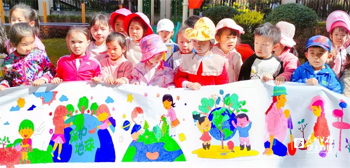 活动前,各班级教师通过图片和故事向孩子们介绍“植树节”来历和习俗、植树的意义及如何爱护小树苗的小常识。在教师的带领下,孩子们先来到幼儿园内的种植区,以班级为单位种下班级树,并为小树苗浇水。小班孩子种植番茄、向日葵等植物,在参与劳动过程中学习生物多样性知识。中大班孩子各自发挥创意,集体创作了一幅以“植树节”为主题的10米绿色环保主题绘画,呼吁大家保护生态环境。