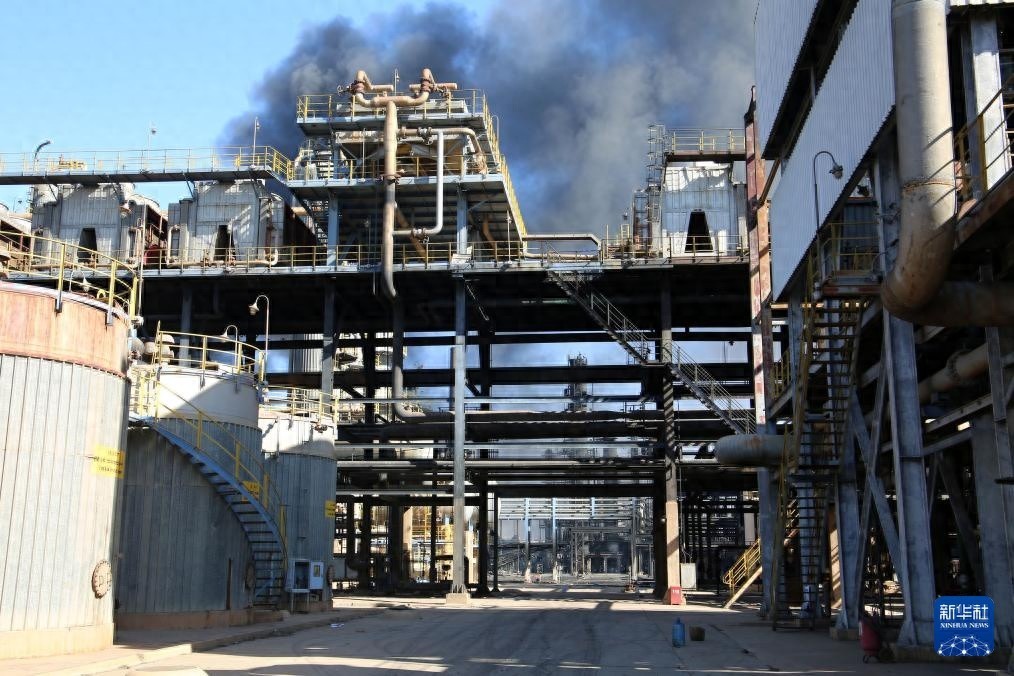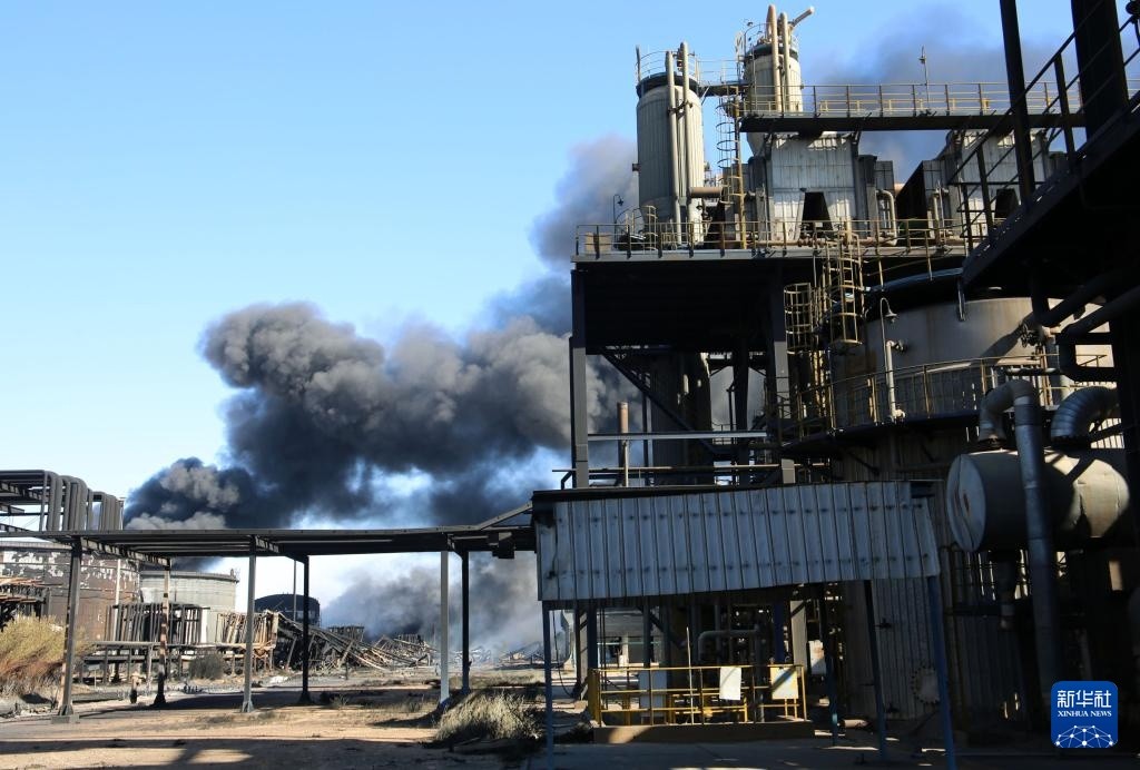 1月26日,在苏丹首都喀土穆北部杰利地区,遭破坏的喀土穆炼油厂冒出浓烟。