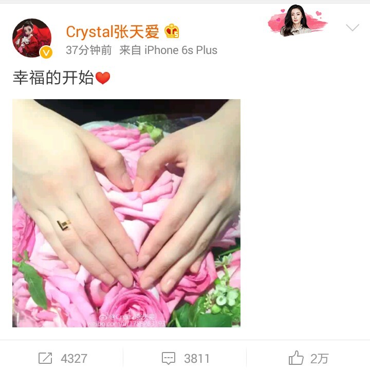 今日,张天爱发了一张手捧爱心的图片,手指上还戴了戒指,还说:“幸福的开始”。