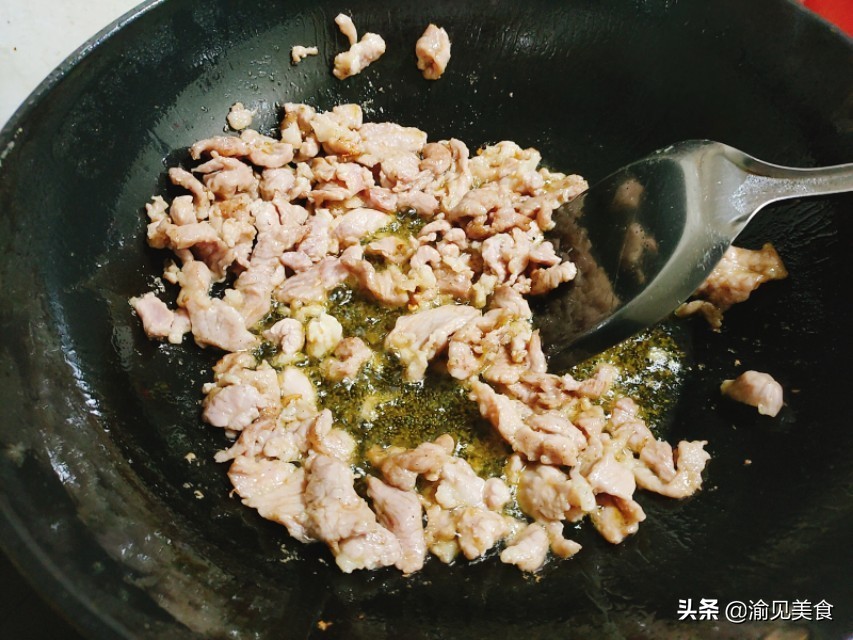 起锅烧油,油温8成热,倒入腌制好的眉毛肉,翻炒均匀,炒至8成熟,盛出备用。