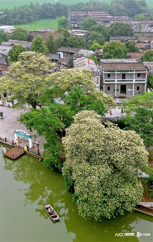 4月26日,台山市水步镇草坪村,已进入盛花期的鱼木繁花与塘中水色相互映衬,尽显岭南村落的婉约之美。