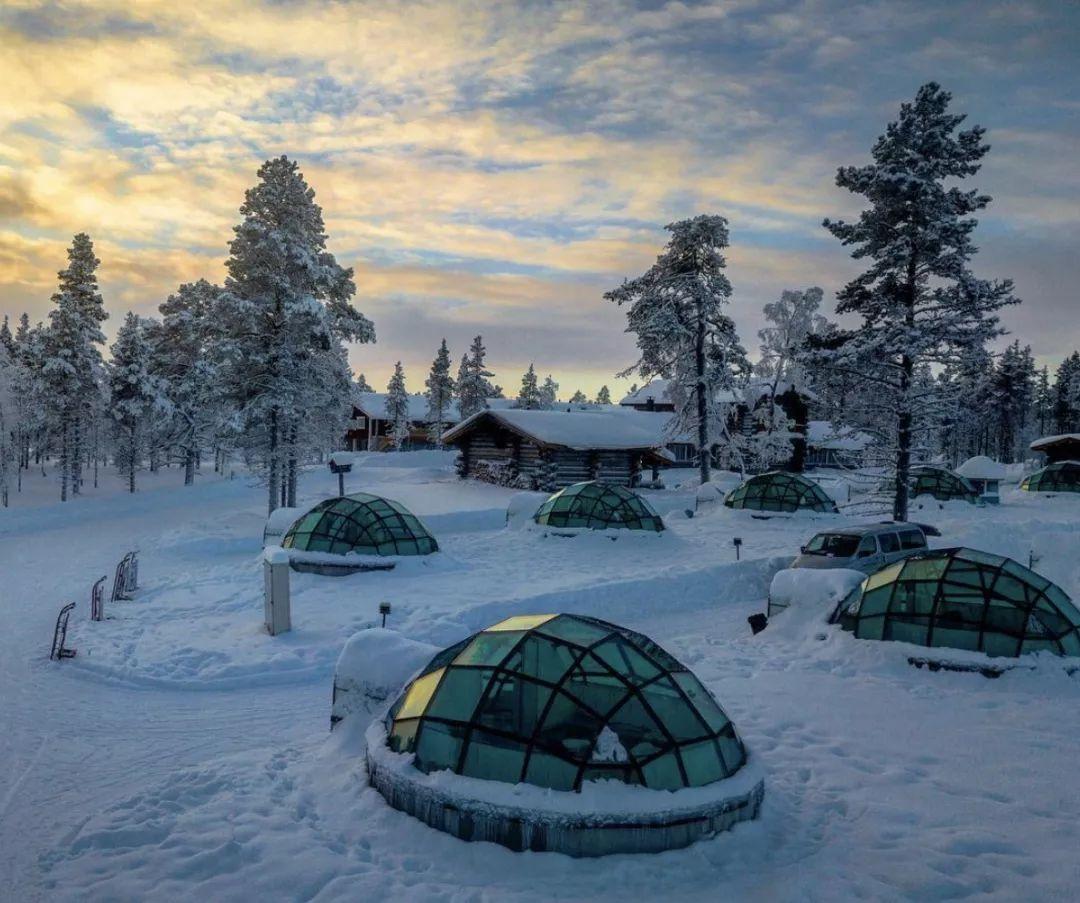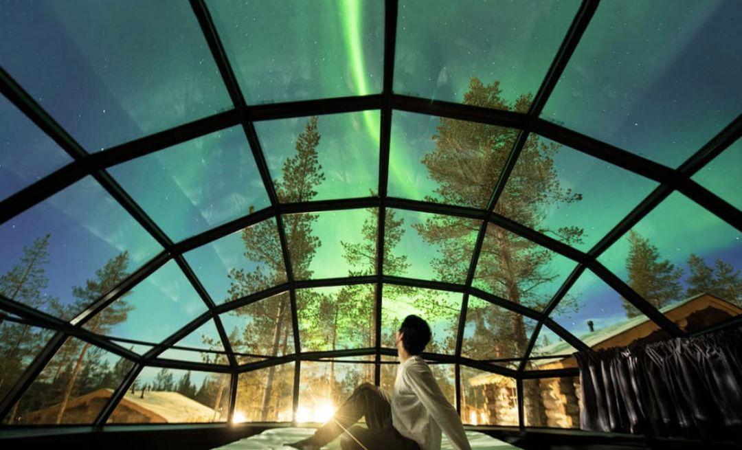 尽管度假村内还包含具有原生态气质的小木屋以及圣诞老人主题房等,但对于游客们来说,玻璃圆顶房的魅力似乎是无可替代的。一间间玻璃屋如同透明的太空舱一般,整齐地排列在山林间的雪地上。在这里,游客们无需深夜外出“狩猎”极光,只需要躺在柔软的床铺上,便可看满天极光漫进房间里来。