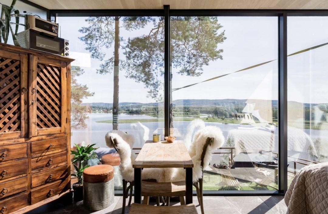 小屋并不是完全方正的,更靠近陆地的一侧由木质建材打造而成,相对低矮,相对高挑的一侧则借助宽大的落地窗构建起一个更加简单、随性的居住区域。清晨,阳光穿过洁净的落地窗将屋内的浅灰色地毯照得暖融融的。住客们可以慢悠悠地煮上一杯咖啡,然后惬意地倚靠在躺椅上,看清风在水面上拂起微澜。