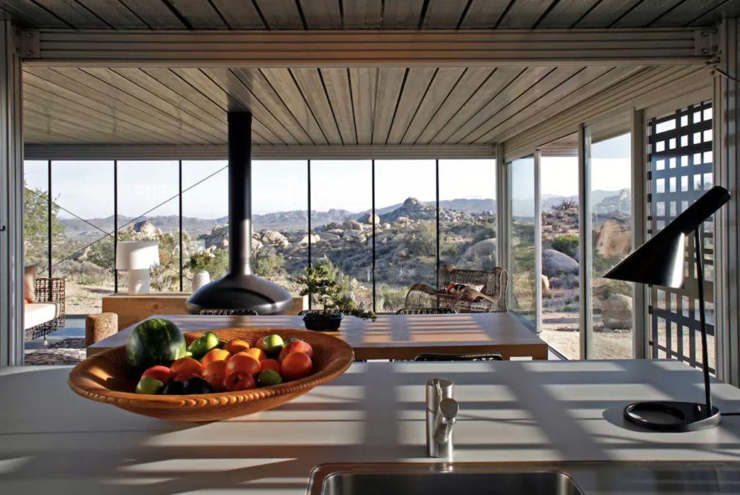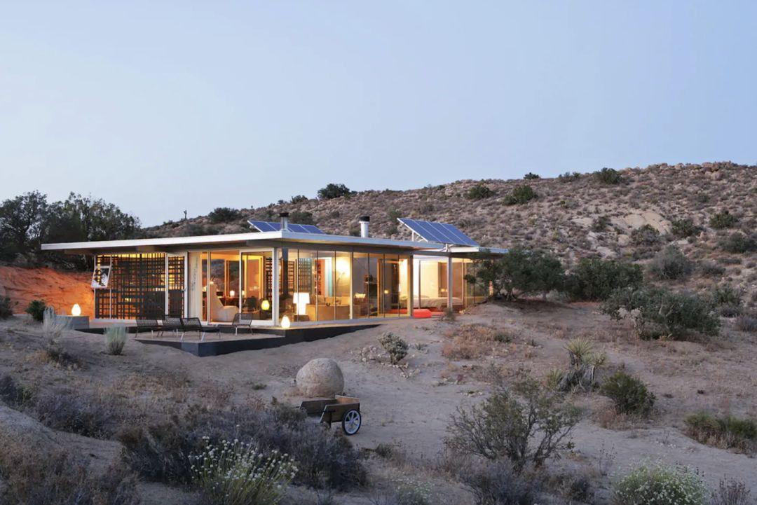 如果说之前提到的玻璃小屋装饰,还带着几分自然的野性气质,坐落在美国南加州广袤沙地中的Off-Grid iT小屋则保留了更加鲜明的工业气息。不锈钢建材以及铁艺的座椅、装饰物等,搭配上太阳能电池板,显得简单而干净。这里既没有电视空调、也没有网络,设计师希望能够通过这种方式,让人们放下手机,走进更为真实的自然世界。