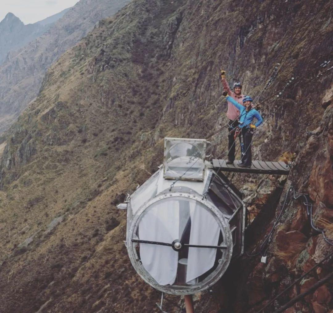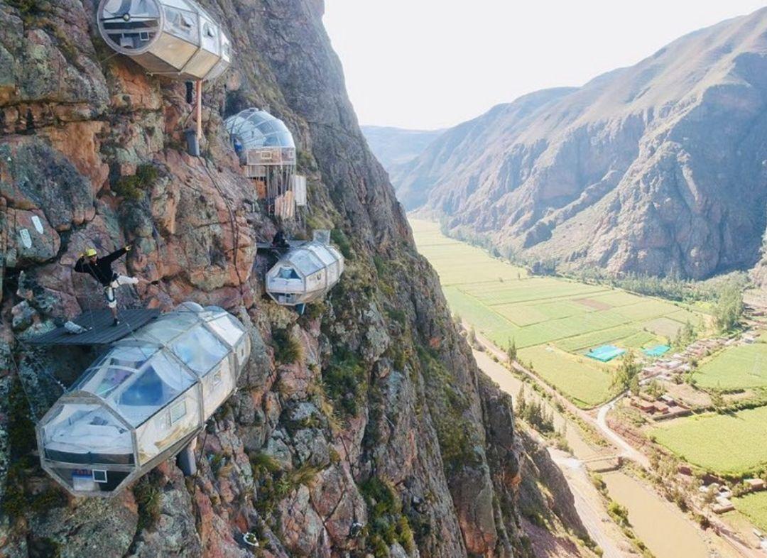 在入住秘鲁的天空小屋之前,住客们需要率先确认,是否拥有一颗强大的心脏。在库斯科和马丘比丘之间的神圣谷,3间玻璃吊舱式的小屋,借助加固的、抗风化材料和结实的链条,悬挂在距离地面366米的悬崖边上。想要入住天空小屋的住客们,需要带好安全装备,然后沿着陡峭的小径攀登上山崖,在工作人员的带领下到达天空小屋。在这里,住客们可以足不出屋,饱览神圣谷的壮丽风景。