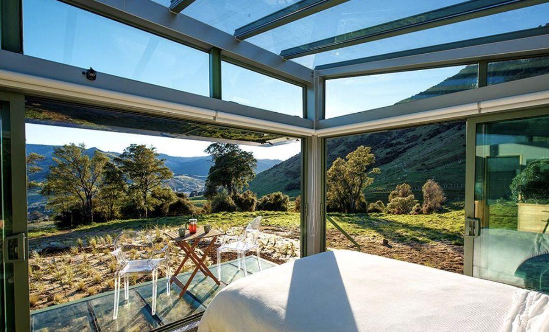 PurePods小屋内外处处是风景。小屋内没有地毯、没有天花板、没有窗帘,甚至没有Wi-Fi和电视,四面环绕的玻璃墙和透明的穹顶让周围的风景和小屋无缝衔接。于是,蜿蜒的河流、起伏的山丘成为了小屋的天然装饰物,日升日落时,光线逐渐变化,在房屋内外描摹着新西兰的不同风情。