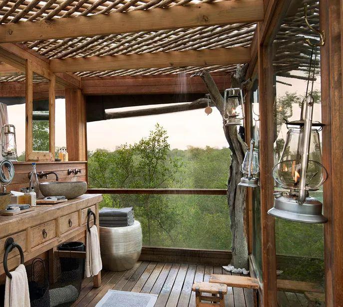 这个“野”字在树屋的装饰风格中也体现得很明显。整间树屋的屋顶由长短、粗细不一的树木组成,搭配上宽大的玻璃窗以及古朴的布艺门帘,显出几分原生态的味道。化身衣帽架的实木、深灰色的水池以及深棕色的水龙头等,则将这份野性进一步加深。