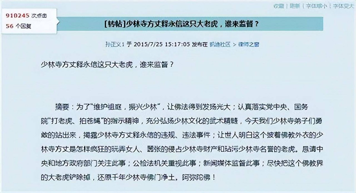 就在少林寺的发展如火如荼之时,2015年,互联网上一篇实名举报的文章,引发轩然大波。