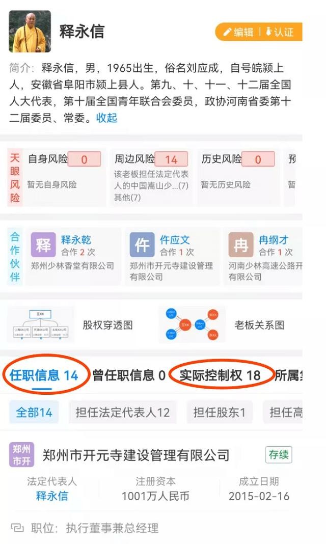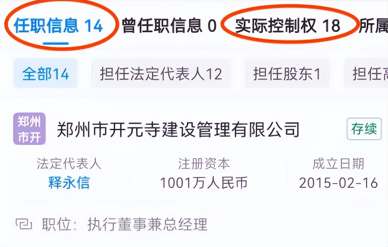据统计,释永信管理着十八家公司,并且全都是实际控股人。