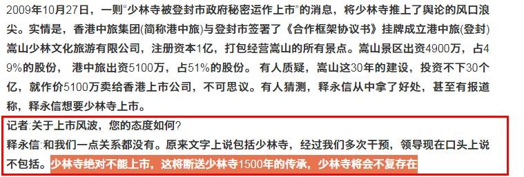 释永信更是说出,少林寺上市的话,会直接断送千年的传承。