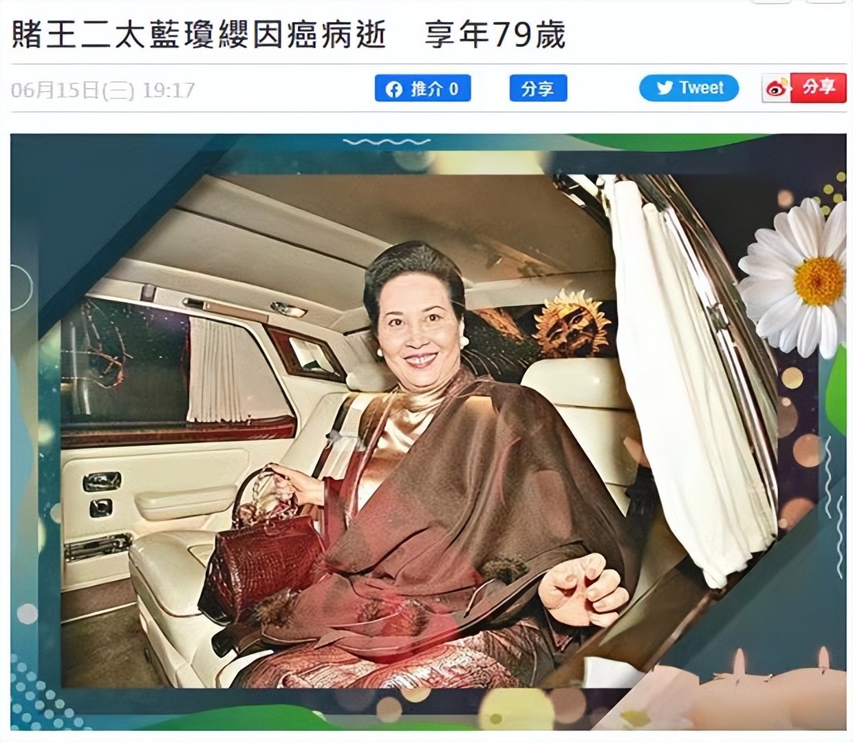 据港媒报道,在赌王去世两年后,赌王二房太太蓝琼缨也于6月11日寿终正寝,享年79岁。
