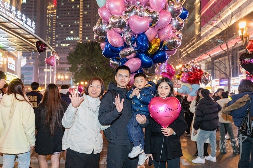 一簇簇流动着的彩色气球、一片片挂满树梢的彩色灯饰、一个个精心设置的新年美陈……2024年12月31日,解放碑步行街火树银花、繁华璀璨,处处洋溢着喜悦的气氛。晚上7时,记者刚踏入解放碑步行街,就被这里的迎新氛围所感染。