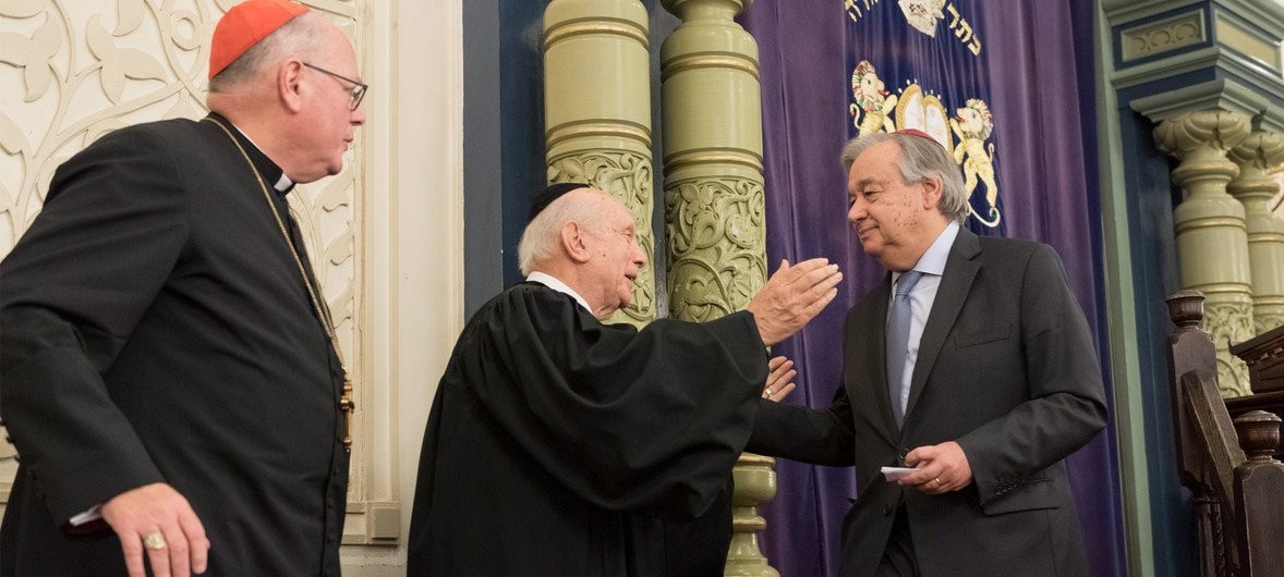 联合国图片/Rick Bajornas联合国秘书长古特雷斯(右)与纽约公园东犹太教堂资深拉比施奈尔(中)及天主教会纽约总主教多兰(左)共同参加匹兹堡市“生命之树”犹太教堂袭击案受害者悼念活动。(2018年10月图片)