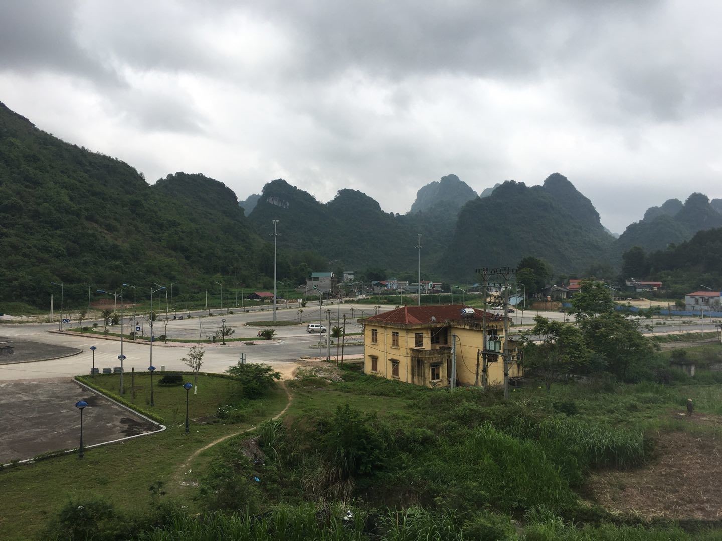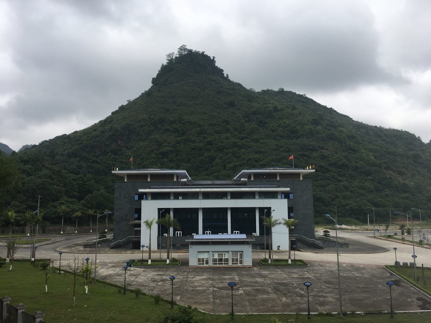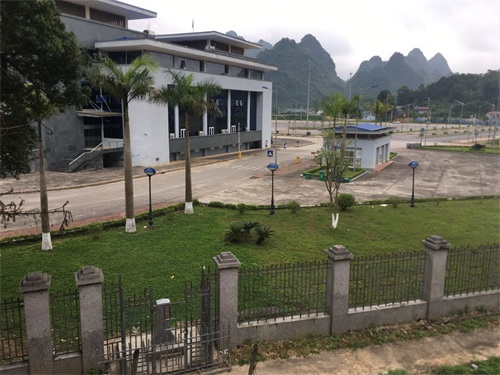 越南边检大楼与背后的孤岛峰丛。越南一侧与中国广西龙邦口岸相对应的是“高平省茶岭县雄国口岸”。