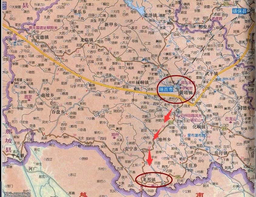 靖西市区与龙邦口岸的位置关系对应图。目前高速公路已通抵口岸,而田(东)靖(西)铁路也应延伸到龙邦,为这座西南国际门户增强综合运输体系。