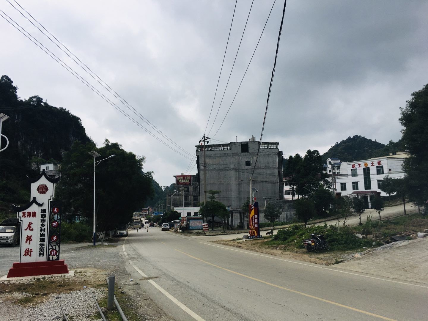 龙邦街为靖西市龙邦镇驻地,距离口岸约2公里。龙邦状语意称“桄榔树的山弄”,因地处中越边境,清代即在此设立戍防关隘,并开展边贸互市交易,为竹木、金银花、木菠萝、山楂等山货物资集散地。场圩南侧还有金鸡炮台等历史古迹。其中在龙邦镇界邦村,这里是龙邦口岸的大宗货物出入境通道,并建有物流园区,服务中越两国的商贸交易及货品流通。