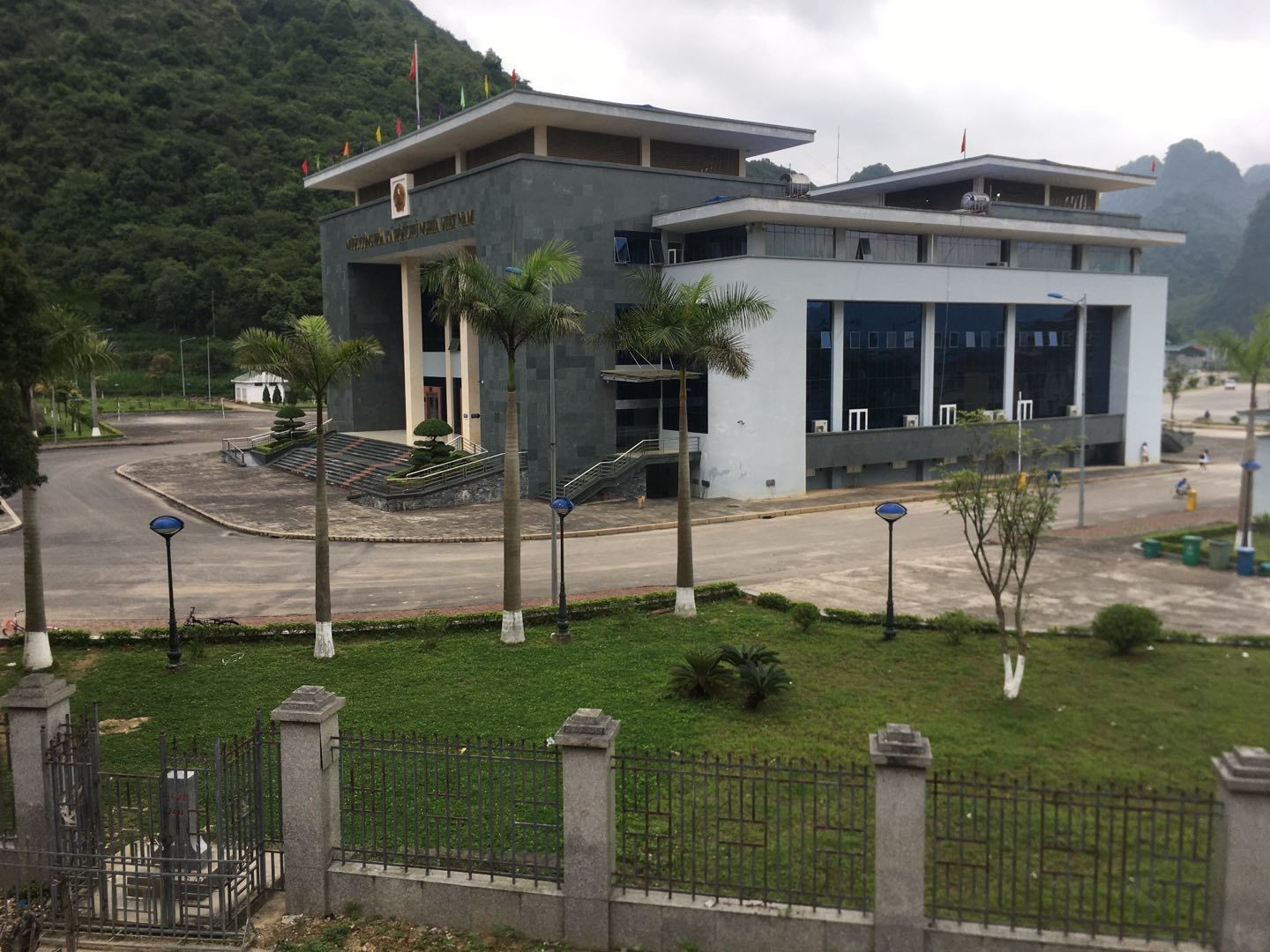 越南边检大楼侧面全景。这时有一群越南小孩竟说着英语跑到了边界铁栏杆处向中国游客们打招呼。在此感觉越方对边界管理没那么严格,只要不跨栏越界,怎么玩都可以。
