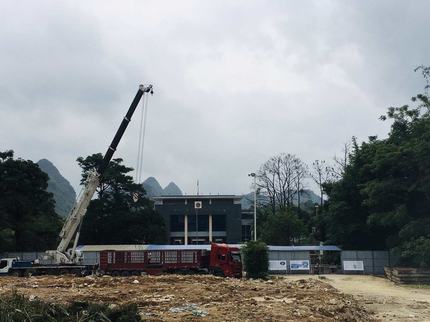 远处是龙邦口岸越南一侧新落成的边检大楼,近距离的塔吊原是中国一侧的边检大楼,但最近已被拆迁,计划在原址修建一座新楼,与越方相对遥望。据中方边检人员介绍说:“以前中国边检大楼未拆除时,都要比越南的大楼气派很多”。如今时隔近一年,不知道现在那里的建设进度如何了,也许仍受疫情影响,尚未复工吧。摄于2021年5月1日。