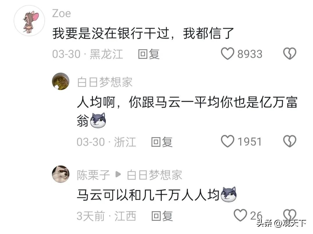听起来确实是吓一跳,但事实真的是这样子的吗?要知道这是人均薪酬,许多银行高管拿着几十万上百万的年薪,而普通打工人柜员一年辛辛苦苦只有几万块钱。不少网友表示:要是让马云跟自己平均一下,高低也能上个胡润财富榜。